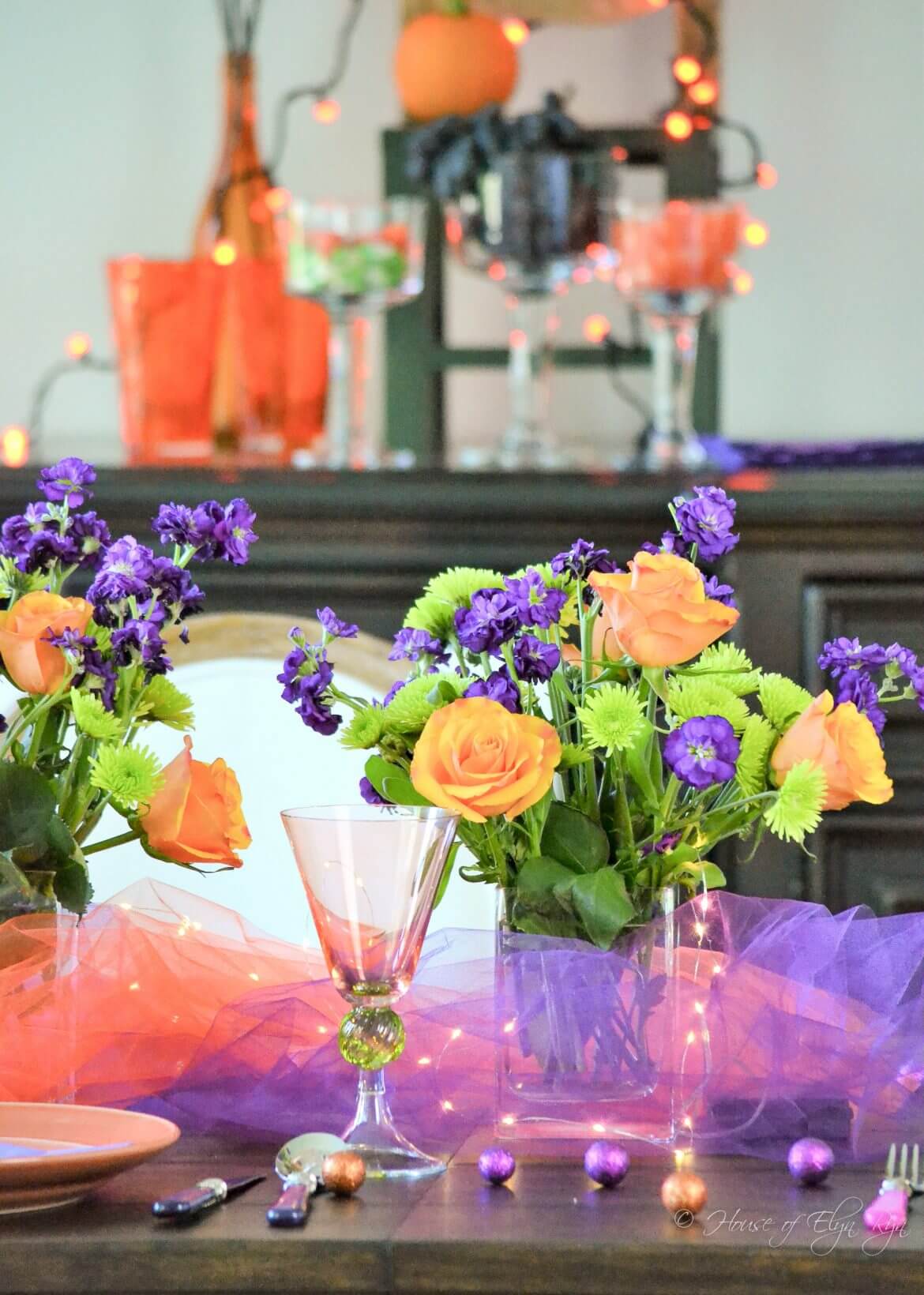 It’s a beautiful time of year and a little “boo” is what makes fall so much fun. Whether for Halloween or just for fall, an orange, purple, and green tablescape is lively and downright fun. I used battery-operated fairy lights under the tulle. I found some old drinking glasses tucked back behind some things I don’t often use. Fortunately, the colors were perfect for this table.