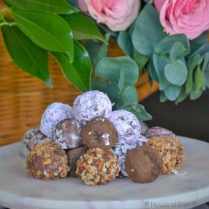 Try rolling the truffles in colored confectioners’ sugar available online. Alternatively, you can easily make your own at home. Simply place confectioners’ sugar in a food processor. Next, add a few drops of gel food coloring and process until the sugar changes color. To begin, add just 2-3 drops of gel color, then add 1/2 to 1 cup of sugar, adding more gel color as needed. For instance, the truffles shown in these photos were rolled in a blush-pink confectioners’ sugar.