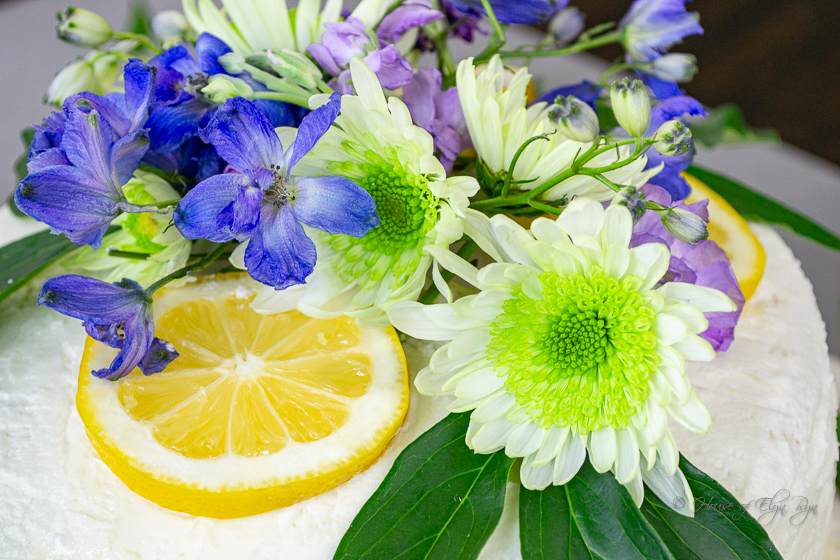 - Place flowers and lemon slices on the cake in a pleasing arrangement.