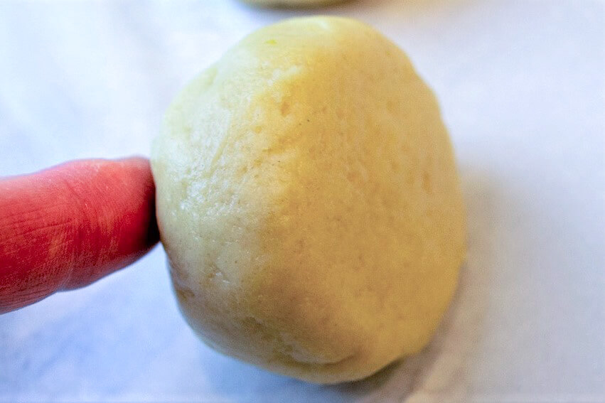 Work the dough and then roll it into a smooth ball. Place it on parchment paper on a cookie sheet and press down to flatten the underside, while still keeping the dome intact.