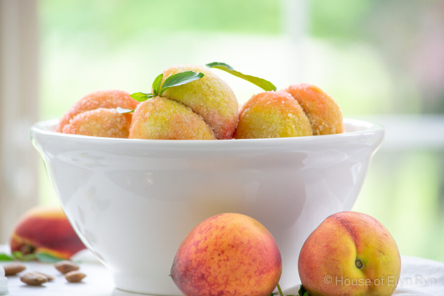 Imagine making peach cookies that are so realistic that on first look people mistake them for real peaches. That’s the fun of these Italian peach look-alike cookies or pesche dolci. They are shortbread stuffed with ricotta cheese and coated with sugar. You don’t have to be an artist to create them either. I made larger cookies to photograph, but found that no one wants to eat a cookie the size of a baseball! You should probably make them the size of walnuts or apricots. Of course, the larger they are, the more realistic they look. Click here to jump to the recipe.