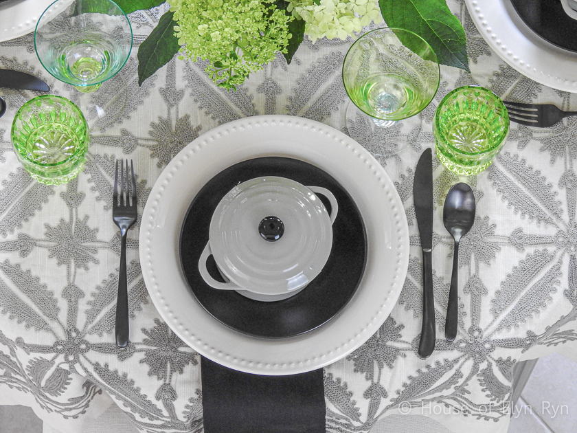 Next, I selected a table overlay throw featuring gray embroidery on an off-white background. I then placed black napkins under the dinner plates for an elegant touch and opted for two different green glasses to add variety.