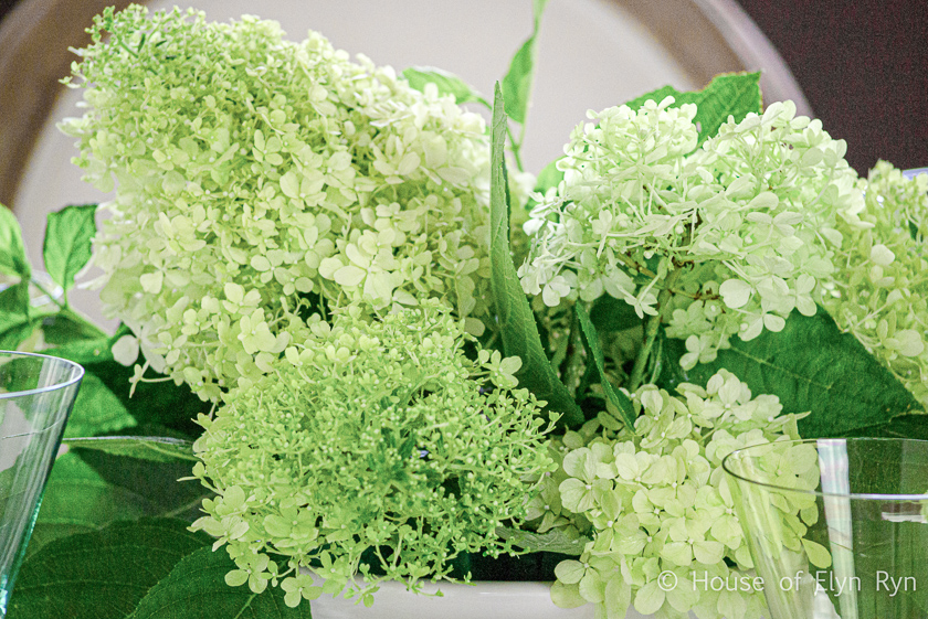 I love a gray-and-white table! However, incorporating a touch of green transforms the table into a vibrant display! In early summer, I love cutting Limelight hydrangeas (Hydrangea paniculata Limelight) when they’re just starting to bloom, showcasing plenty of green hues. They can instantly brighten up your table!