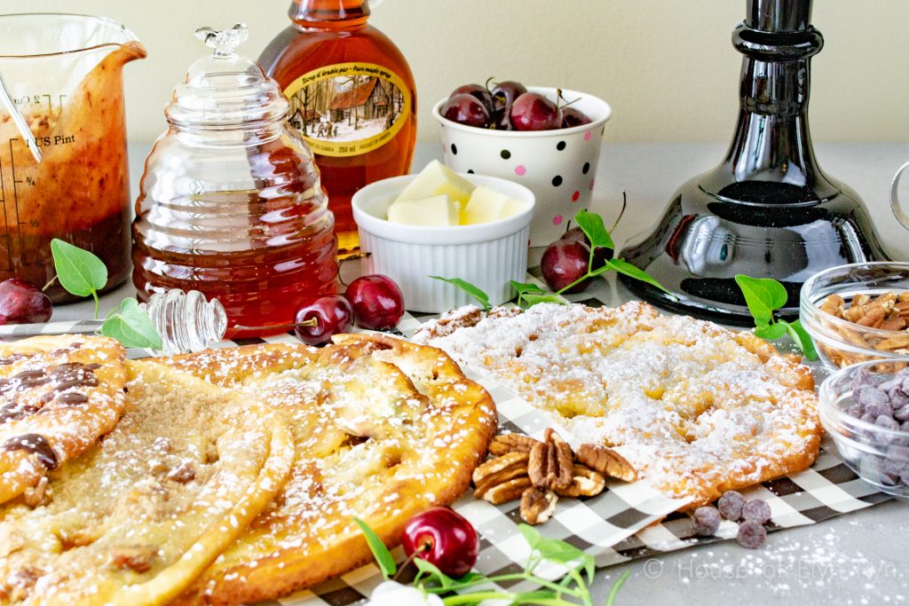 A fun thing to do when you make funnel cakes at home is to make a funnel-cake bar that contains different toppings for different tastes.