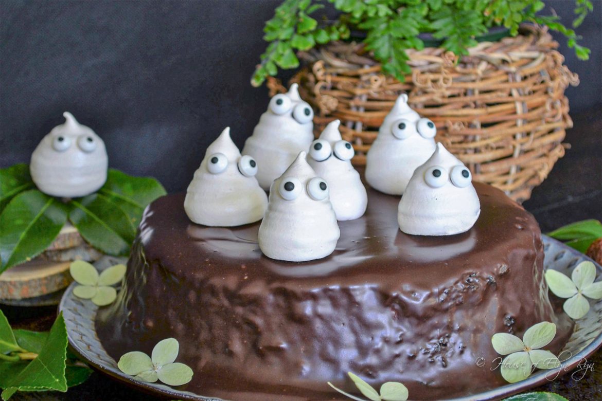 Chocolate Olive Oil Cake with Ganache Frosting and Meringue Ghosts