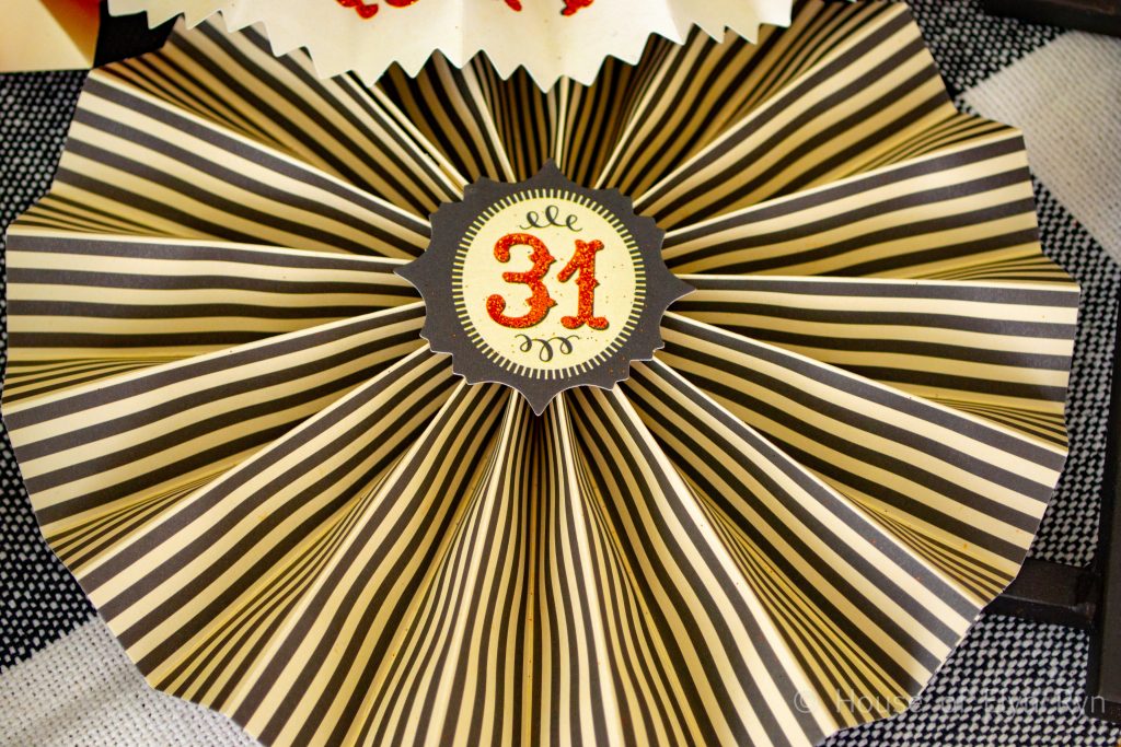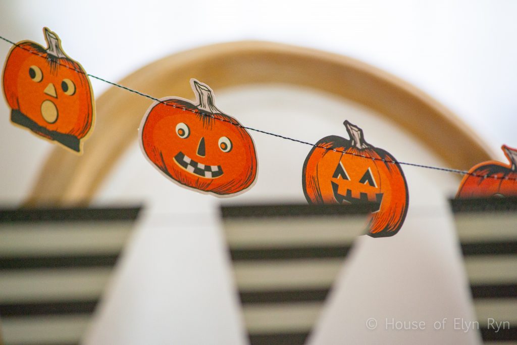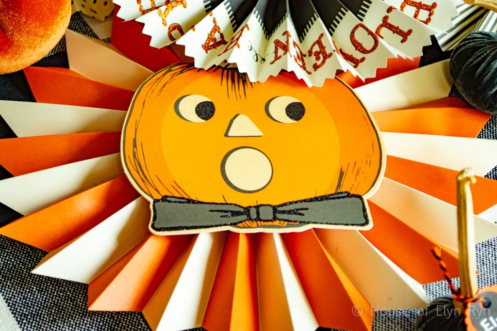 This table uses wall party fans (found here) for the centerpiece and hanging flag and jack ‘o lantern banners all with a vintage look. A black and white table throw is a good backdrop. This one is not available anymore but click here for a similar one.