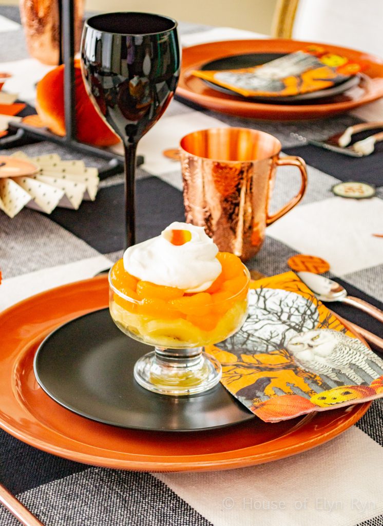 Orange paper plates can be substituted for stoneware plates. A muted orange-colored paper plate says vintage, while a bright orange plate says modern. Copper flatware found here or black flatware like I used in the Light up the Table with Limelights post works well with the orange and black look. However, silver flatware works well too. If you don’t have something, always use what you have to add your own special touch!