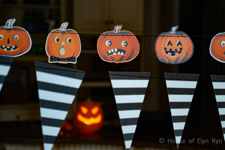 This table uses wall party fans (found here) for the centerpiece and hanging flag and jack ‘o lantern banners all with a vintage look. A black and white table throw is a good backdrop. This one is not available anymore but click here for a similar one.