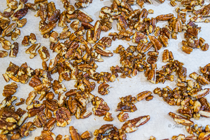 - Stir constantly over medium heat for 2-3 minutes or until the sugar melts, and all the pecans are coated. The sugar will burn quickly, so remove the pan from the heat if it starts to brown. Immediately pour the pecans from the pan onto parchment paper (or silicone mat) and spread out to cool, breaking up any large clumps with a knife.