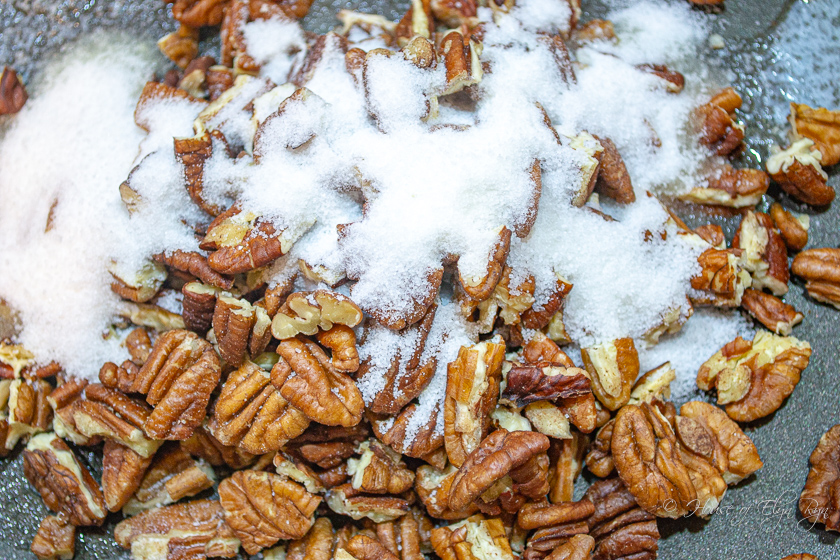 - In a skillet, melt the butter. Add the pecans and sugar.