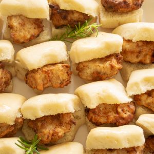- Cut open each yeast roll, leaving the backside attached so the bread will hold the chicken like a glove. Add a piece of chicken and drizzle with the sauce (if using). Then mix the melted butter and honey and brush it on top of each roll. Serve on a platter and garnish with sliced scallions, fresh parsley, or rosemary.