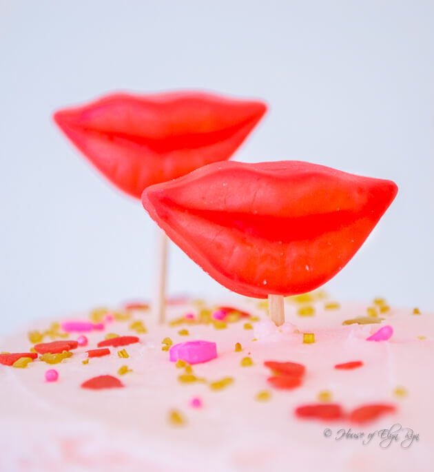 Place the cake on a platter. Frost between each layer and then all over the cake with the buttercream frosting. Then, add colorful sprinkles in Valentine’s colors around the bottom of the cake, extending them up about 1 1/2 to 2 inches. Add them on top of the cake or anywhere else you desire. Finally, insert toothpicks (or skewers) into gummy lips and place them atop the cake for a whimsical touch. Alternatively, use lollipops with lips or hearts for the crowning decorations.
