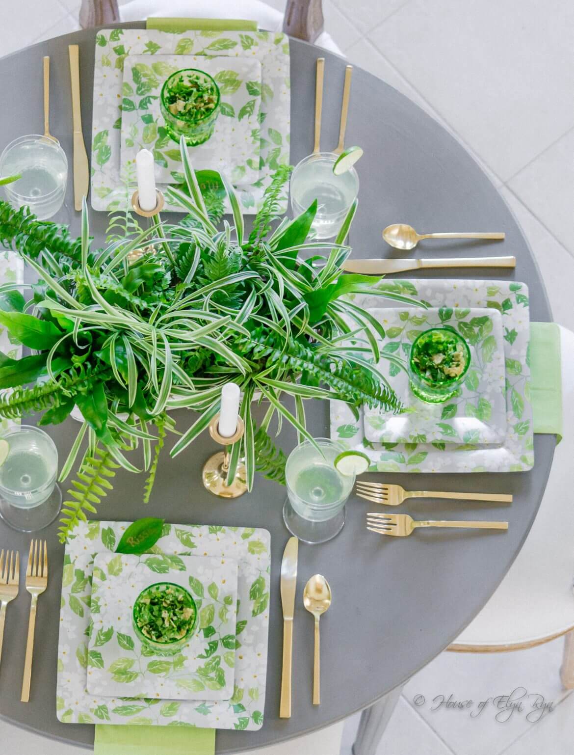 These plates are made by Caspari (click here to see their selection of products) and have a beautiful pattern. I had planned to set a white table with these plates but they are so pretty with green that the table went a different way.