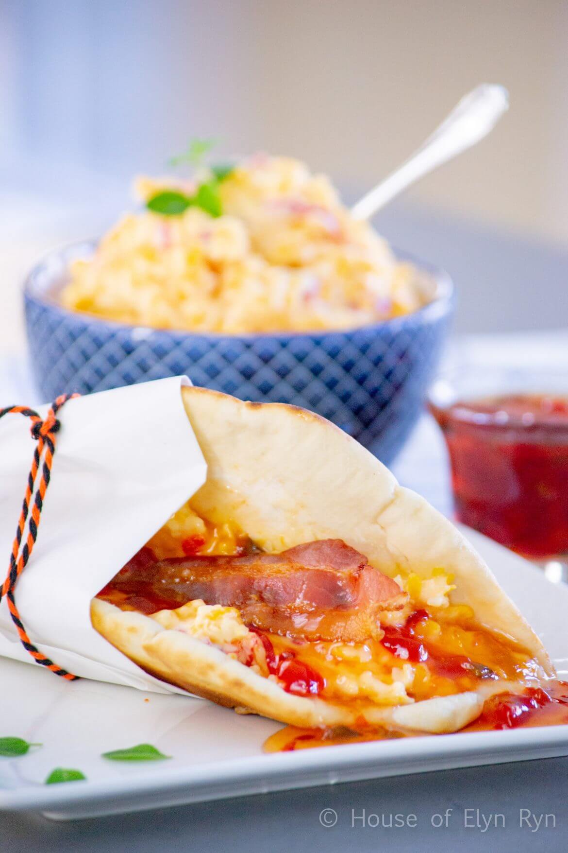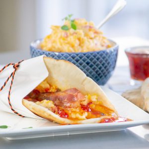 Place a cooked strip of bacon over the pimento cheese and pepper jelly. Fold the pita bread so the bacon is in the middle of the sandwich. Serve.