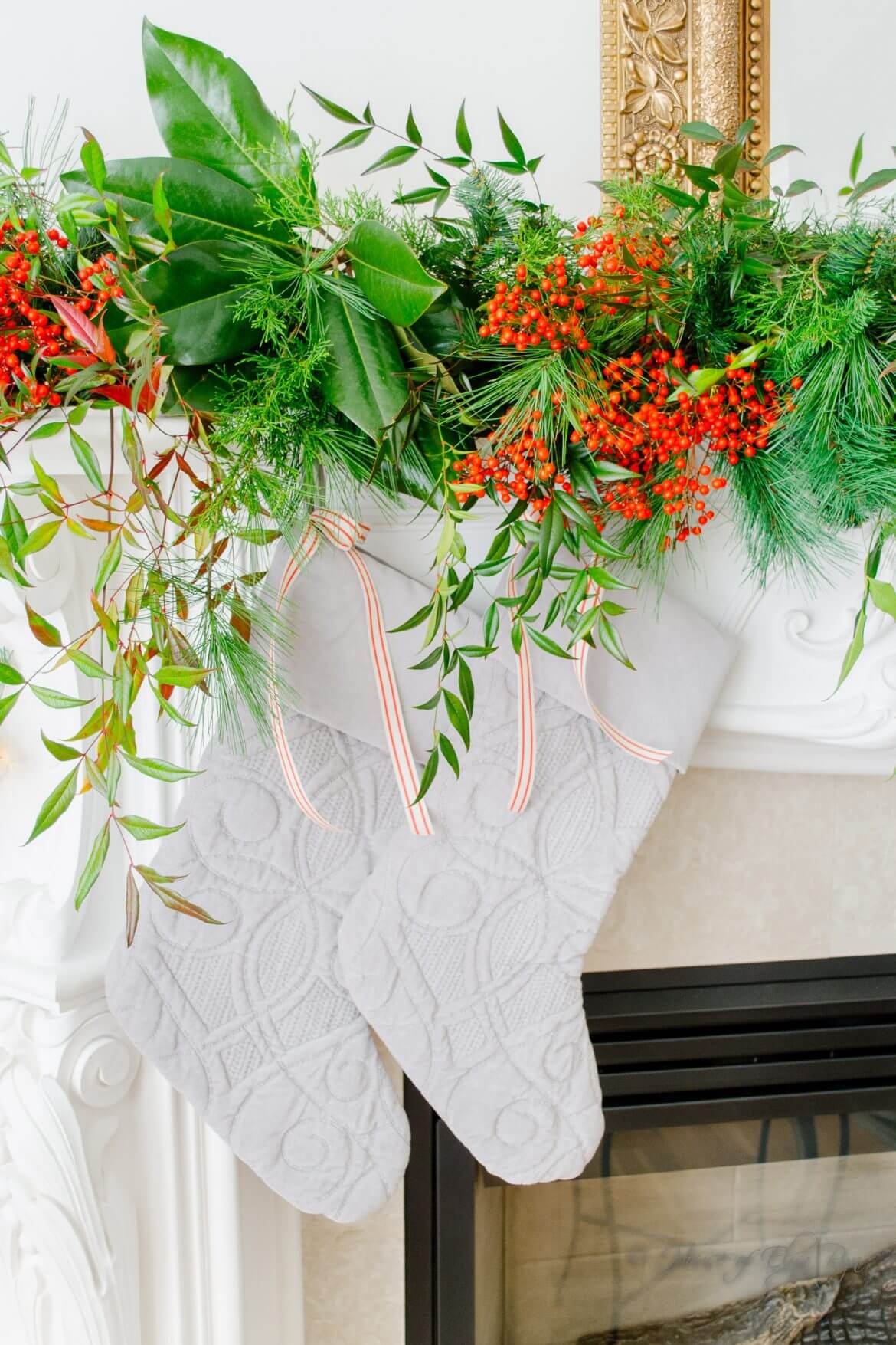 The green mantle has a faux green garland base–just your basic garland with lights woven into it. I placed it across the fireplace mantle and added cut evergreens, nandina stems, and berries.