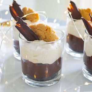 When you are ready to serve this dessert, garnish with peanut butter cookies and chocolate decorations.
