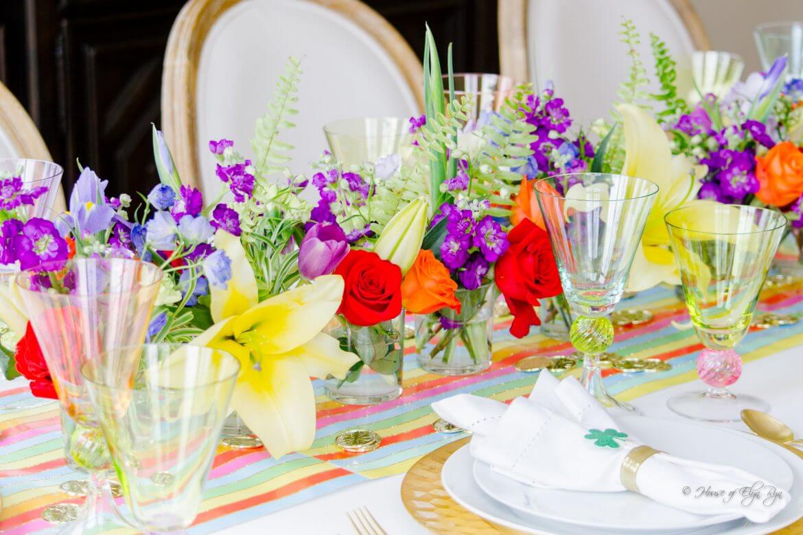 To incorporate a bit of whimsy, I scattered plastic gold coins along the middle of the table, referencing the legend of leprechauns hiding their pot of gold at the end of a rainbow. Gold-wrapped chocolate coins would also make a delightful addition for guests to enjoy after the meal.