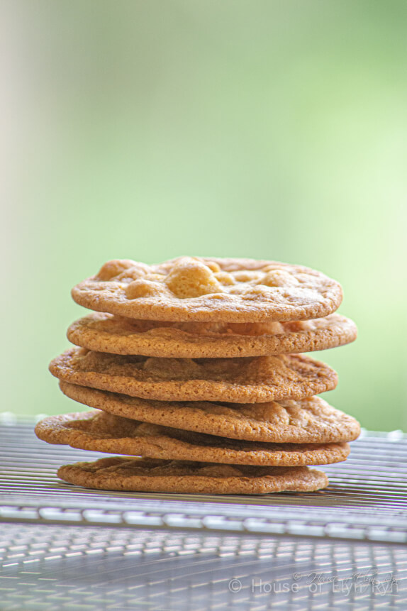 For maximum crispiness, be sure to cook these cookies until they are a caramel brown color. If undercooked and lightly browned, they will not be as crispy in the middle of the cookie and will have two different textures - crispy on the outer edges and softer in the middle.