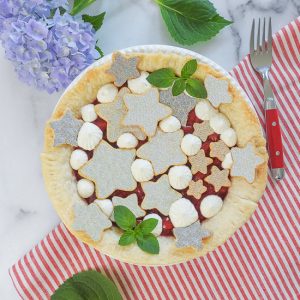 Begin with ready-made refrigerated pie crusts, or use your favorite homemade recipe. Make sure to prepare two crusts: one for the bottom of the pie and another for cutting out star shapes with cookie cutters. For the pastry stars, decorate them with various shades of blue sanding sugar (sources included in the recipe notes) before baking. You can bake the stars at the same time as you bake the bottom crust by using a separate baking sheet and keeping a close eye on them so they don’t over-brown.