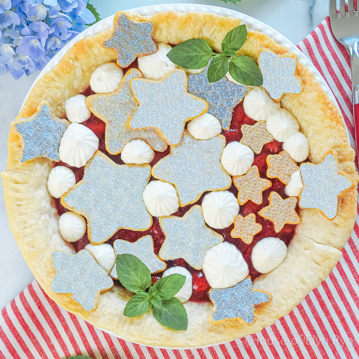 Begin with ready-made refrigerated pie crusts, or use your favorite homemade recipe. Make sure to prepare two crusts: one for the bottom of the pie and another for cutting out star shapes with cookie cutters. For the pastry stars, decorate them with various shades of blue sanding sugar (sources included in the recipe notes) before baking. You can bake the stars at the same time as you bake the bottom crust by using a separate baking sheet and keeping a close eye on them so they don’t over-brown.