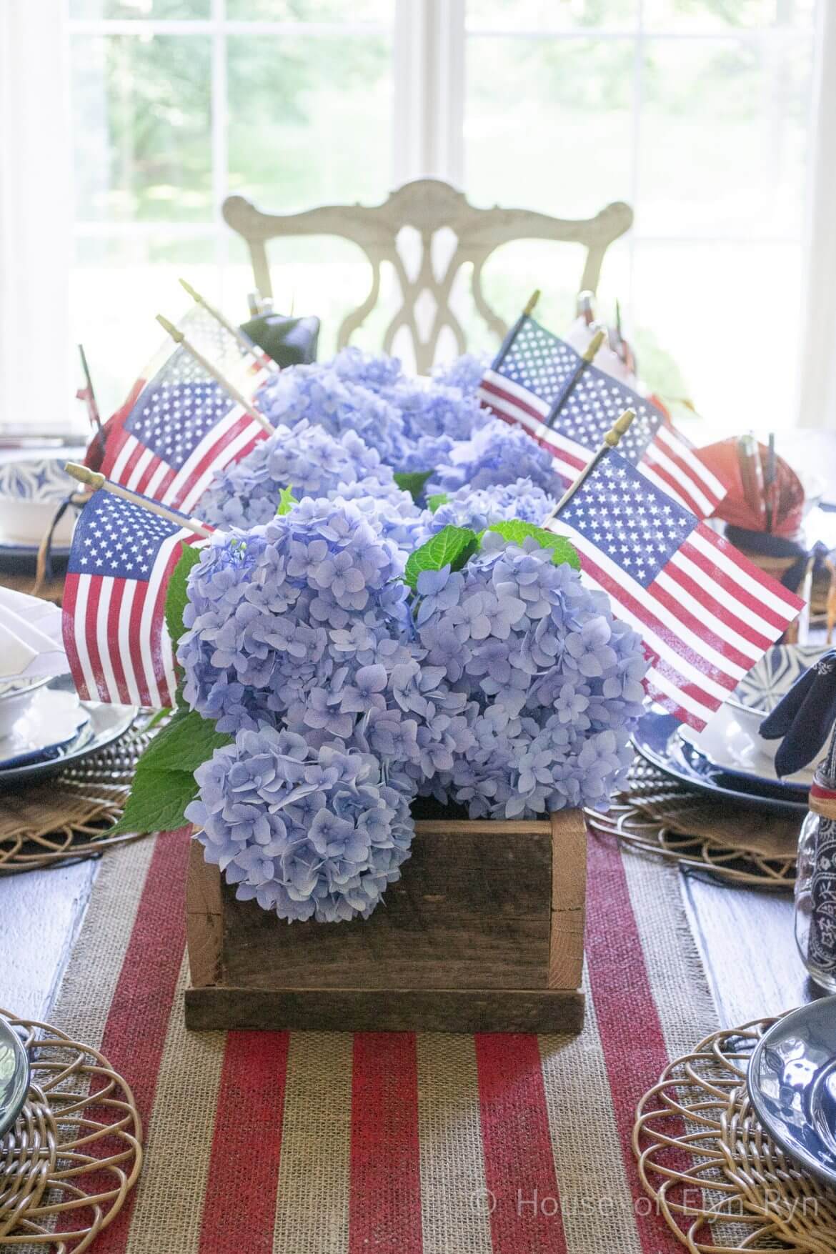 Create a charming, festive table for a rustic July 4th celebration that also works for Memorial Day gatherings. This table features patriotic colors and an easy-to-make centerpiece that combines fresh blue hydrangeas with a rustic flair.