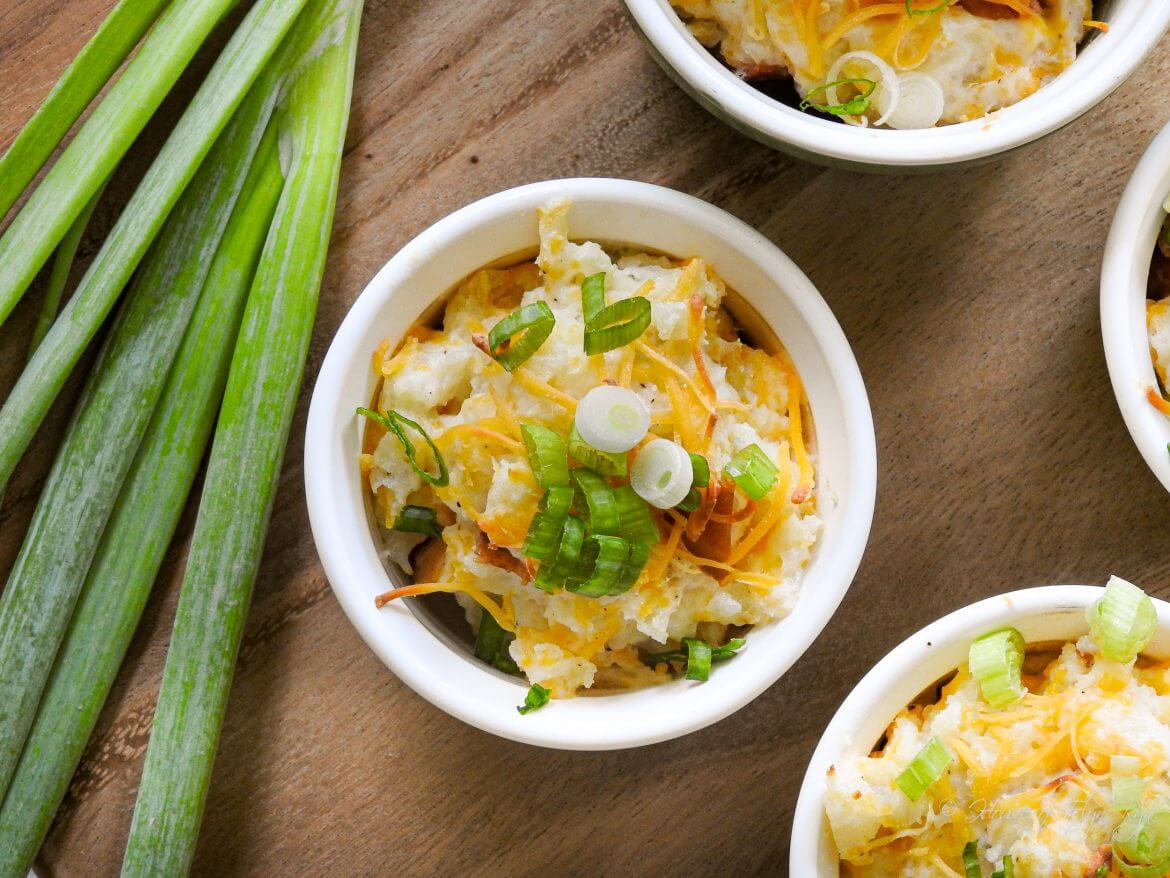 - Divide the potato mixture between (8) 4-ounce ramekins. Sprinkle the tops with the remaining cheese. Bake for 5 minutes. Garnish with green onions.