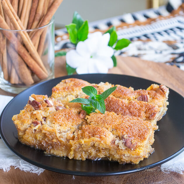 Use a mixer to blend the filling. However, if your cream cheese is soft enough, you can mix it by hand, ensuring all the lumps are smoothed. Add the filling to the top of the crust, then sprinkle with the remaining cinnamon sugar. The pecans on top are optional. These bars are just as delicious without the pecans, so the choice is yours!