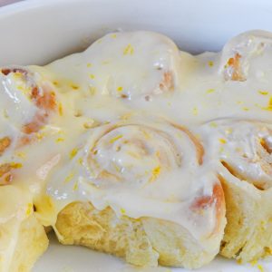 This recipe makes plenty of icing for the rolls. Use as little or as much as you like. Garnish with a slice of orange and a little extra orange zest sprinkled on.