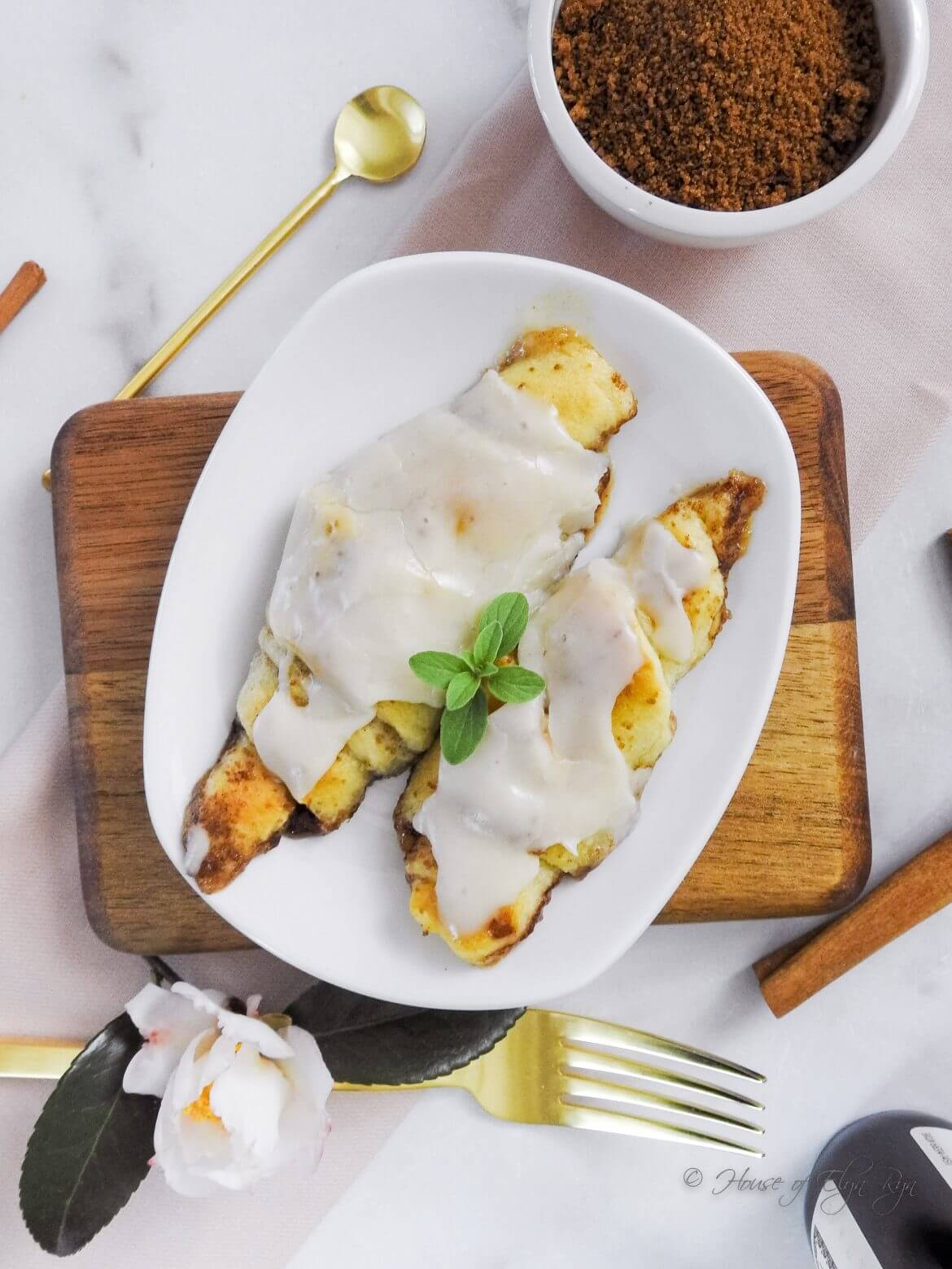 Mix the frosting while the cinnamon rolls bake. It is a mixture of melted butter, sugar, flavoring, and cream. If you want to make the rolls less decadent, omit the frosting. Don’t worry because they will still be delicious!