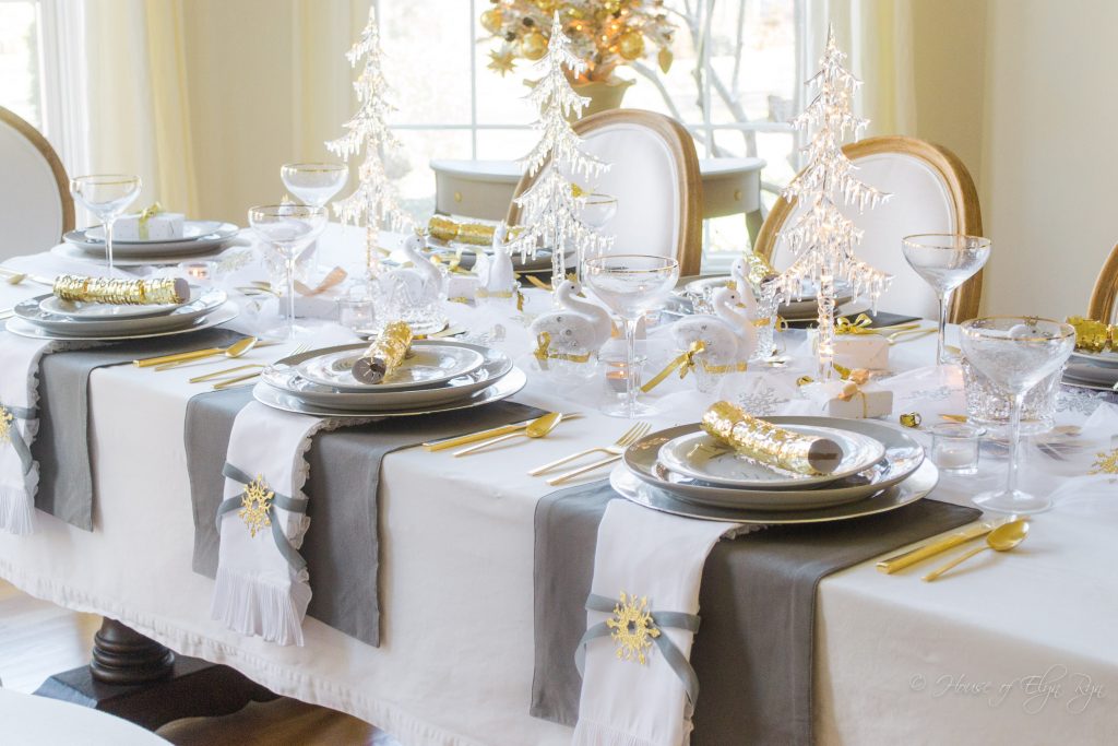 Glittering gold stems cascading from the chandelier infuse the table with whimsy and sparkle. The cascading strands evoke a fantasy of vines gracefully trailing over a serene inlet, where swans glide effortlessly beneath the delicate shimmer. This detail adds an enchanting upper layer to the magical table setting. In the background, gold Christmas trees stand proudly on gray-and-gold tables, harmonizing with the festive ambiance.