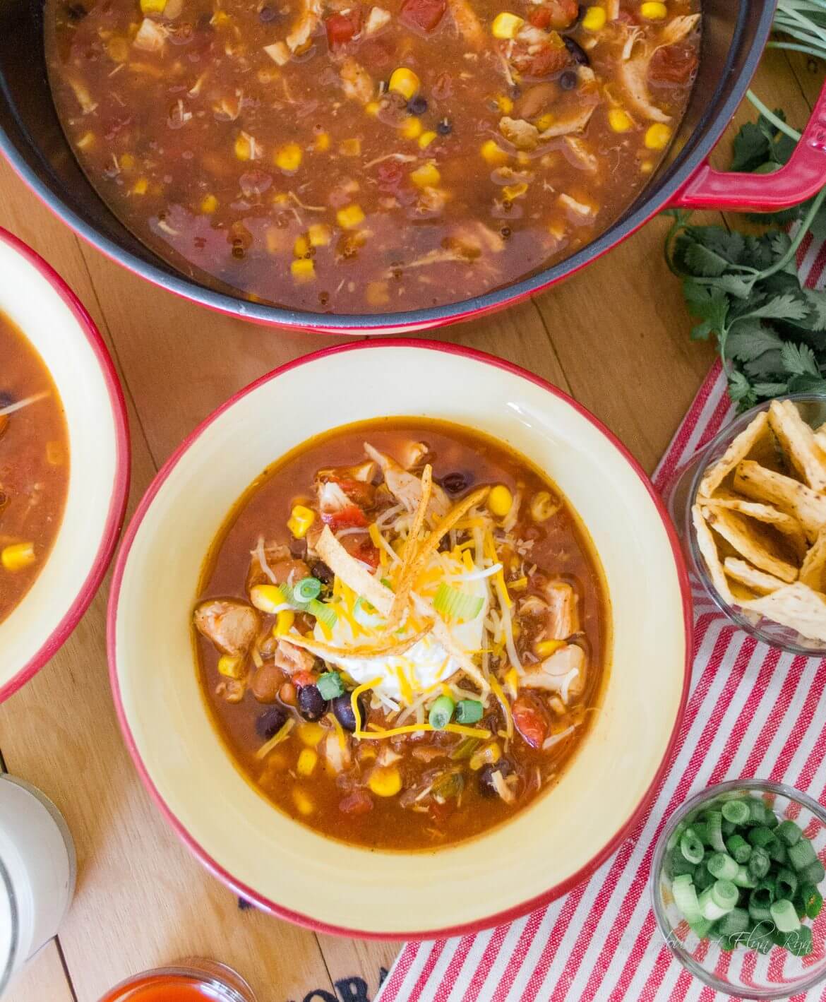 This recipe is similar to my Slow Cooker Chicken Tortilla Soup. However, this quick-cooking soup uses a rotisserie chicken and cooks for about 30 minutes on the stovetop.Â