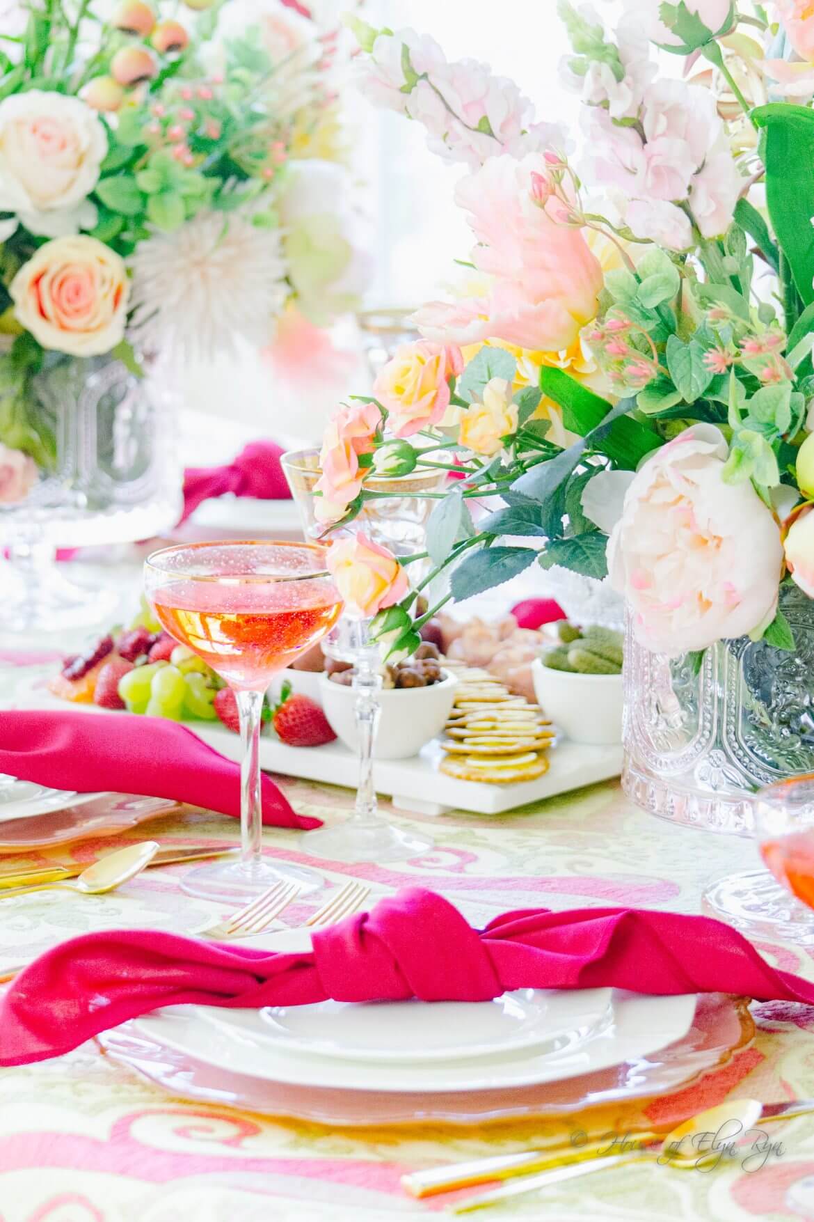 This table is a colorful blend of accents and elegant touches. For the centerpiece, I chose a mix of silk flowers and fresh blooms. The silk flowers are so realistic that it’s hard to tell them apart from the real ones, adding a charming, cheerful vibe to the setting. I placed them in identical large, blush-colored, clear vases. Since they were taller than I usually use, I set them on a side table during the meal so they wouldn’t hinder conversation.