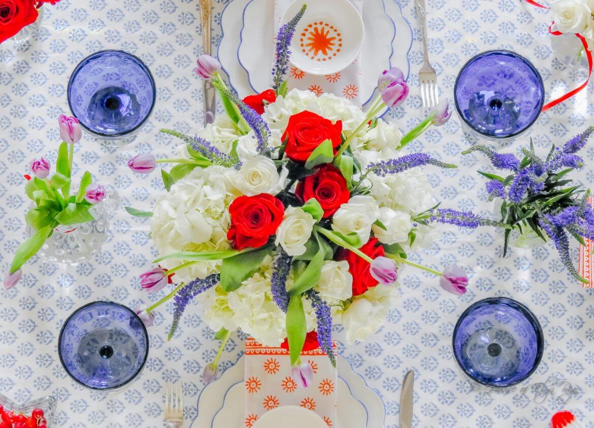 This table can be a colorful summer table or give a nod to a patriotic holiday because of the red, white, and blue colors. Sometimes I prefer this understated rendition for a patriotic holiday. To add more patriotic flavor to a red, white, and blue table, place little flags in the floral centerpiece.