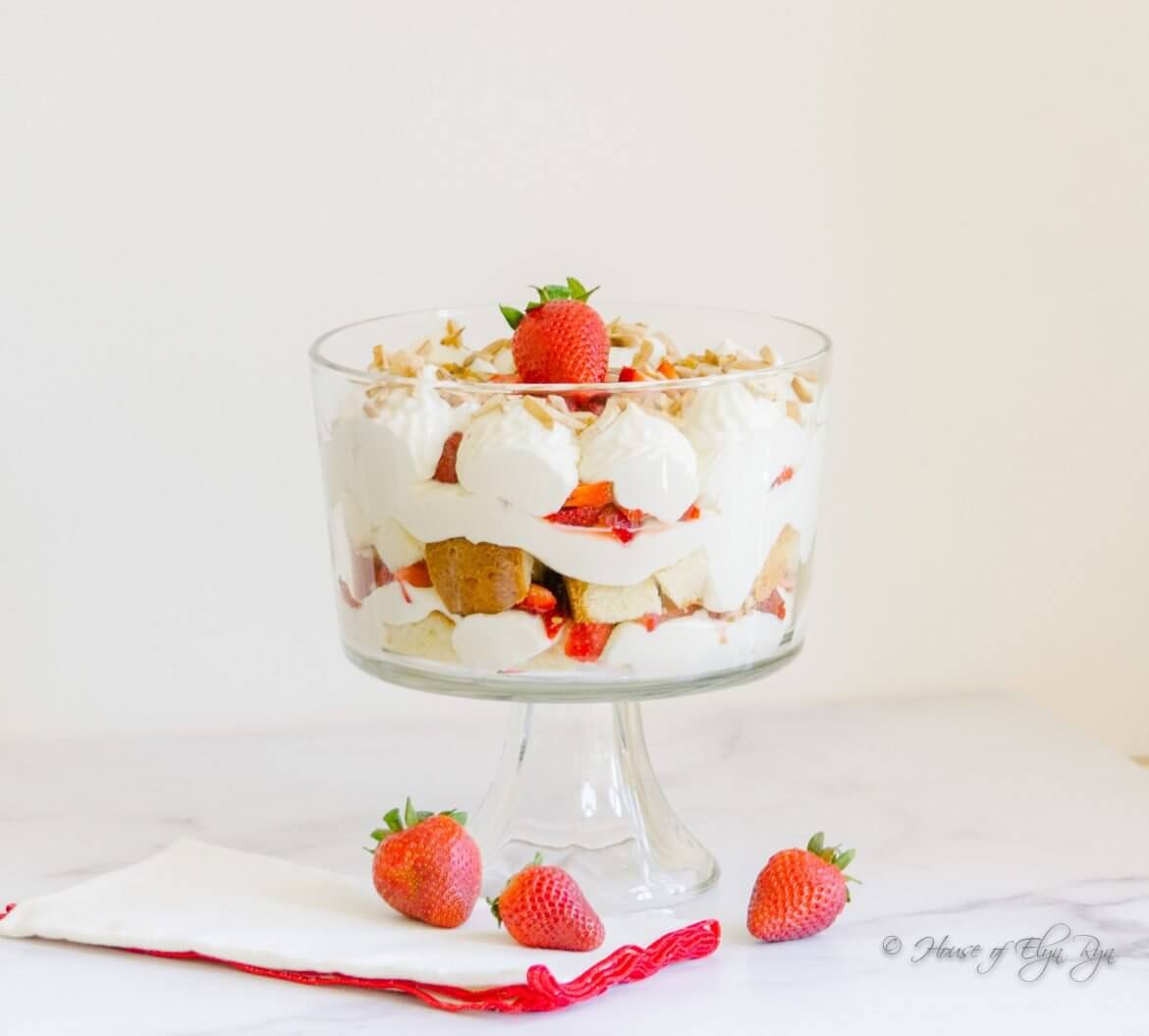 This trifle is made with pound cake, cream cheese whipped cream, fresh strawberries, and toasted almond slivers! It is easy to assemble and can be eaten right away. However, it is also very delicious if eaten the next day because the cream cheese and cake taste better and better the longer they are together!