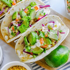 When it’s time to build your tacos, start by placing the fish on the flour tortilla. Then, layer on the lime crema, followed by chopped vegetables and pico de gallo. This order ensures ample room for the fish. If you begin with the vegetables, you might end up overstuffing the tortillas.