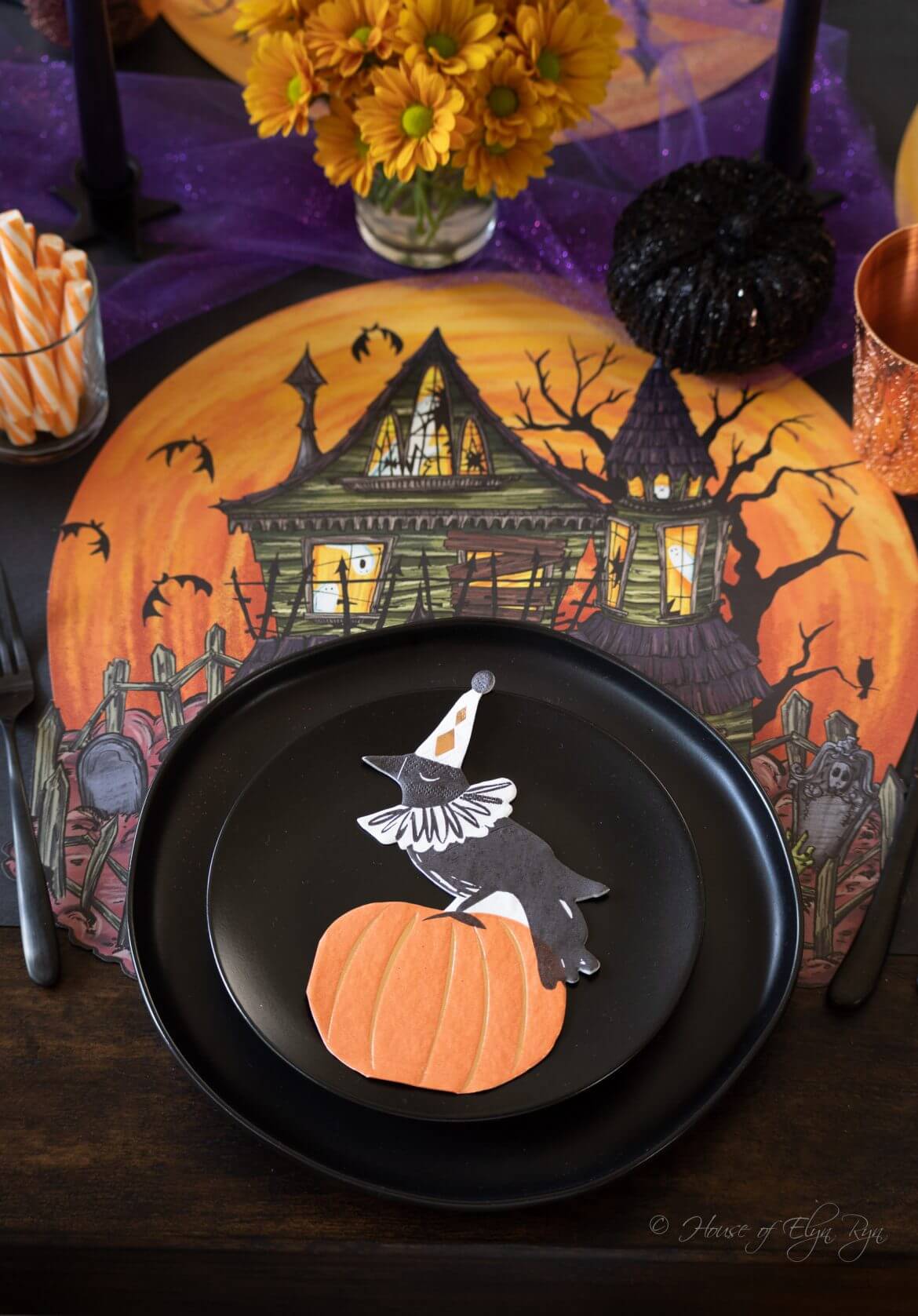 Pull the plates down low on the placemats, as shown below. In this case, the moon and much of the haunted house can be seen. Set the flatware at an angle next to the placemats, and it won’t hide the design.