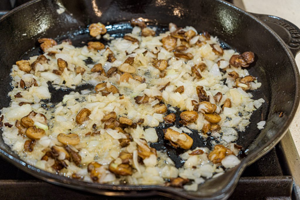 - In the same skillet, melt the butter and add the mushrooms. Sauté them until they are golden brown on both sides. Add the onions and sauté until wilted. Add the garlic and cook until fragrant, about 30 seconds.