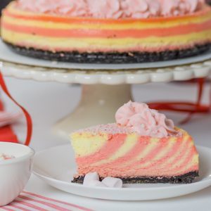 The pleasing stripes in this cheesecake are easy to make. However, you will need to divide the batter evenly between two bowls with a food scale or a measuring cup. Add pink or red food coloring to one bowl of batter. Do not color the other bowl of batter.