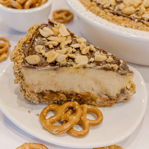 This peanut butter pie has a lot going for it! It has a sweet and salty pretzel crust, a layer of Baby Ruth chocolate bar slices, peanut butter cheesecake filling, a topping of peanut butter chocolate ganache, chopped peanuts, and a sprinkling of sea salt. The great thing about this pie is that it is perfect for a crowd because a slender slice is very filling. It is a great dessert to serve to peanut butter lovers on birthdays, holidays, and other special occasions.