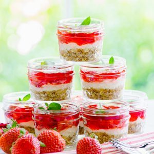 - After 30 minutes, remove the jars from the refrigerator and spoon the chopped strawberries over the cream cheese mixture, dividing the strawberries between the jars.