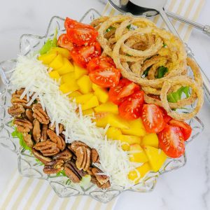This salad is a fave of mine because of the onion rings! It might seem counterintuitive to eat fried onion rings with healthy salad ingredients, but I think it is better to eat them with vegetables instead of other fried foods. They are so tasty and make this salad a real treat!