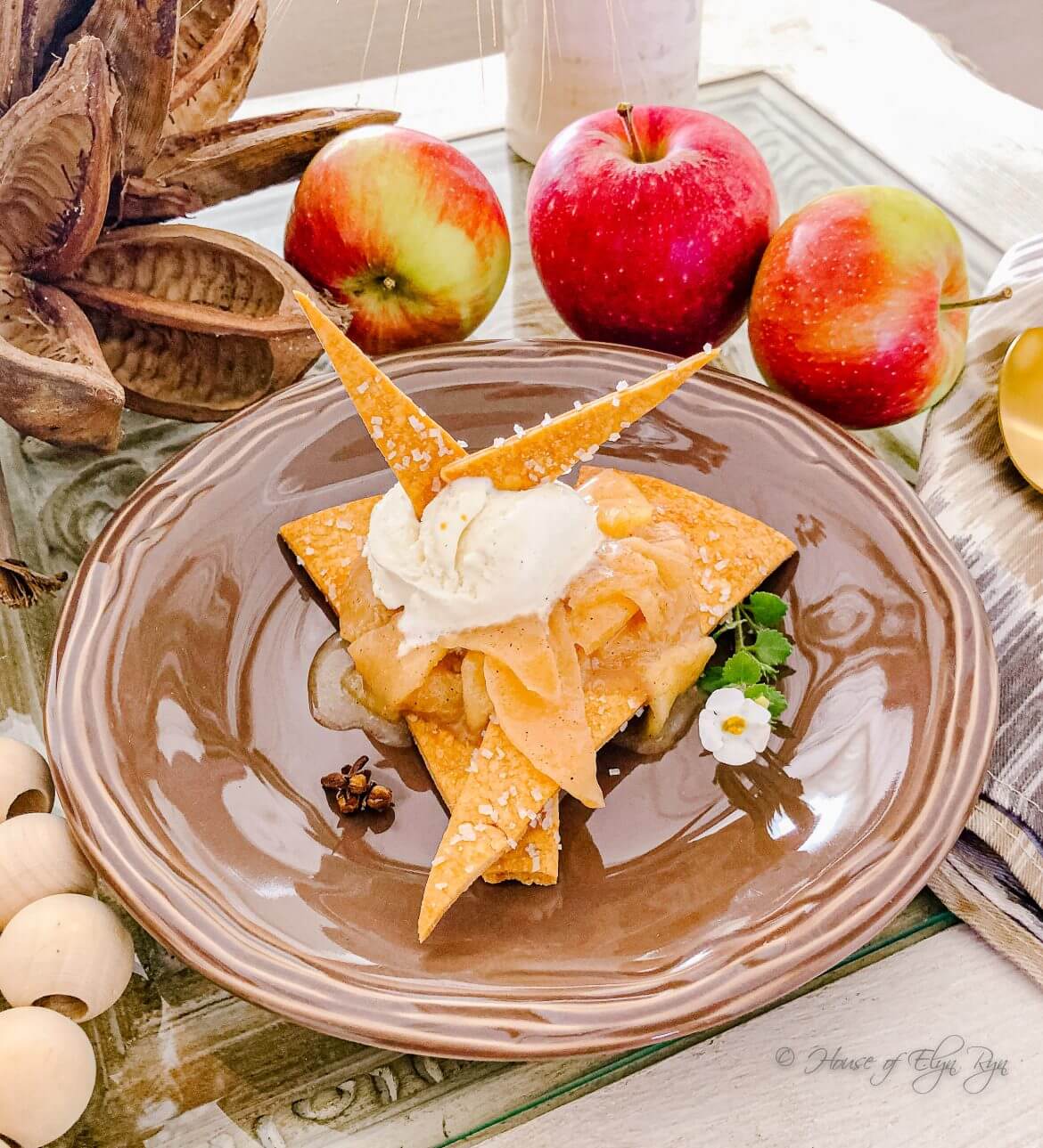Then add a heaping spoonful or 1/6 of the apple filling to the crust pieces on the plate. Top the stack with a scoop of vanilla ice cream, and add any extra cut crust pieces as garnish. Enjoy!