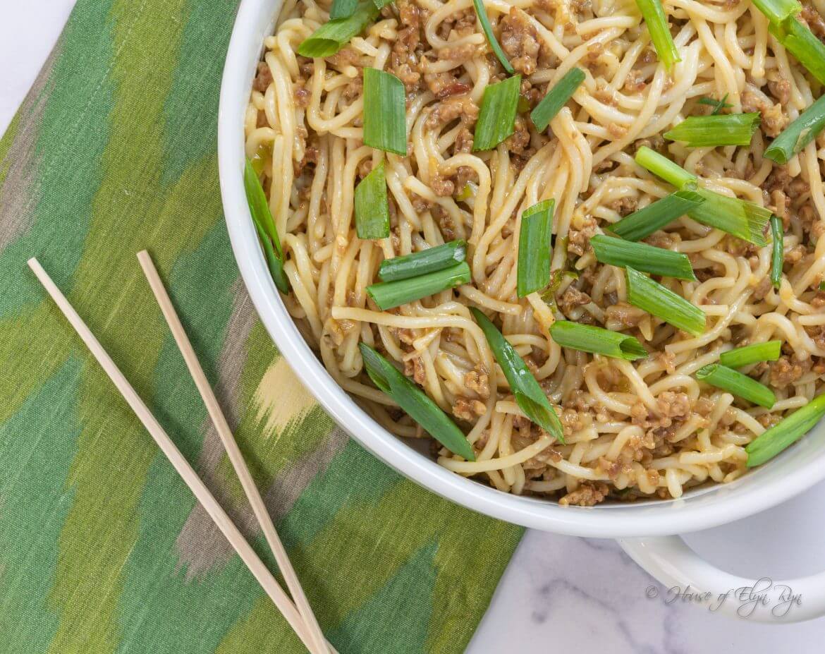 Garnish dan dan noodles with the tops of green onions. Cut the onion on the bias (diagonally) for a pretty presentation. You can also sprinkle finely chopped peanuts on the finished dish.