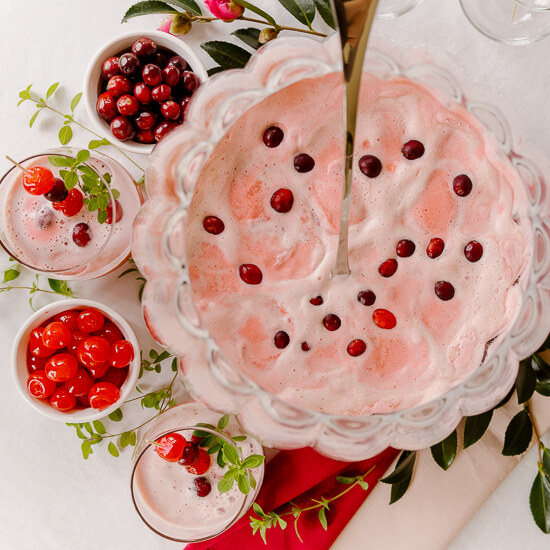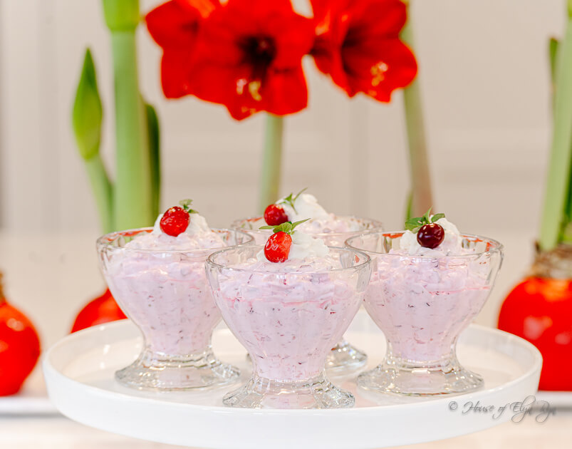 Serve this dessert in clear glass bowls so the vibrant pink color can be seen. Then, garnish with cranberries or mint sprigs, whipped cream, and chopped pecans.