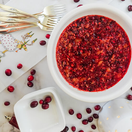 - After chopping, place the cranberries in a medium-sized mixing bowl. Add the sugar and stir. Place berries in the refrigerator for 2 hours.