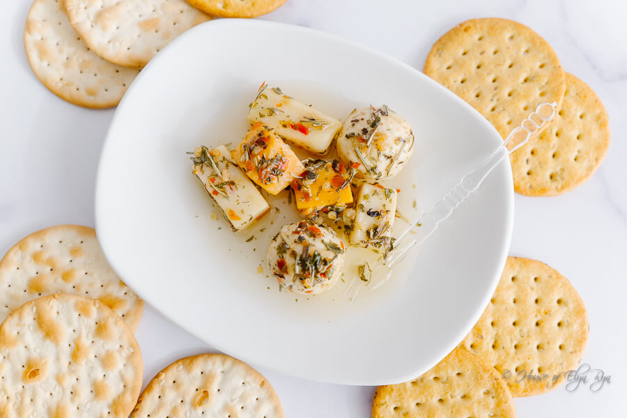 You can marinate cheese with or without vinegar. However, this recipe is made without vinegar and relies on olive oil, spices, and herbs for flavor. Use good quality olive oil, making sure the oil covers all the cheese. Feel free to add other herbs or omit something you do not like from the recipe. It is versatile!