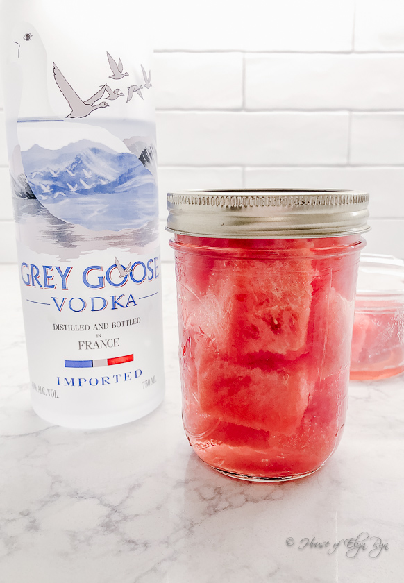 Pour a good-quality vodka over the watermelon, filling the glass jar to the lid threads. The melon will float, which is okay because the lid will hold it in the vodka.