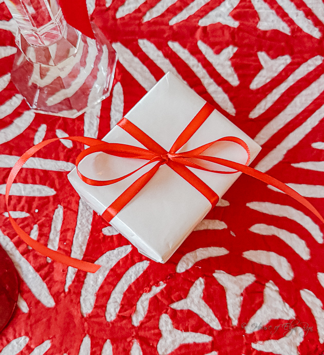The star of the table setting is undoubtedly the unique cutwork quilted tablecloth in red and white. The intricate design not only adds texture but also enhances the holiday spirit. The cheerful red creates a backdrop that radiates warmth. At the same time, the white cutwork introduces a striking element, inviting your guests to admire the craftsmanship. Although this tablecloth is not available for purchase, you can create a similar look by layering a solid red tablecloth underneath a white cutwork tablecloth. Alternatively, you can opt for a red-and-white block-printed tablecloth with a bold pattern. Or consider using a red-and-white quilt.