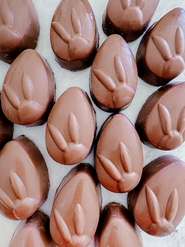After chilling, flip the mold upside down to release all the eggs. They will fall out effortlessly. Be careful not to hold the mold too high above the countertop so the eggs are not damaged upon release. Use a sharp knife to trim the bottoms of the eggs to remove excess chocolate. The eggs are finished and have a cute bunny embossed on the top!