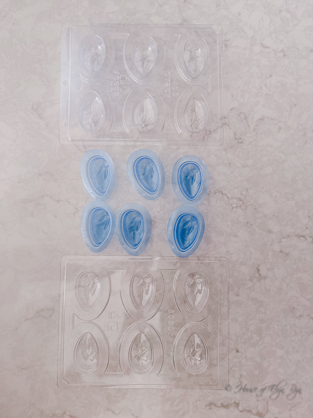 - Once hardened, remove the top mold and carefully pull out the individual molds. Carefully peel off the blue liners from the chocolate to reveal the perfect egg shells.